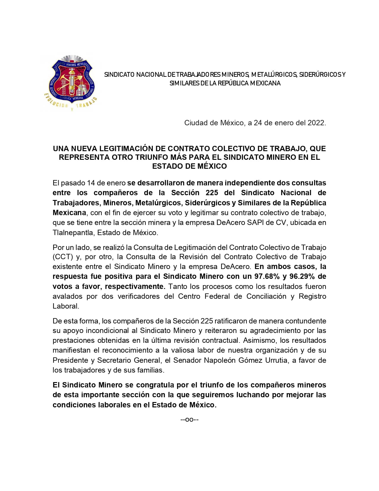 LA LEGITIMACIÓN DEL CONTRATO DE LA SECCIÓN 228, REPRESENTA UN TRIUNFO MÁS PARA EL SINDICATO MINERO EN EL ESTADO DE MÉXICO